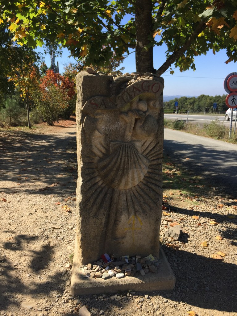 An einer Stelle passierte ich einen großen Hinweisstein, auf dem der Schriftzug Santiago und eine Muschel und ein Pilgerstab in den Stein gehauen sind. Ich schaute auf die Karte meiner Buen Camino App und! In dem Ausschnitt meines Standortes (blauer Punkt = ich) erschien am linken Bildrand die Stadt Santiago de Compostela! Es war schier überwältigend… So viele Male hatte ich mit der Karte meinen Standort überprüft. Immer war der blaue Punkt auf dem gelben Weg, dem Camino, aber nur wenn man den Kartenausschnitt verkleinerte, konnte ich mein Ziel sehen. Nun! Der blaue Punkt und Santiago gemeinsam im Bild!