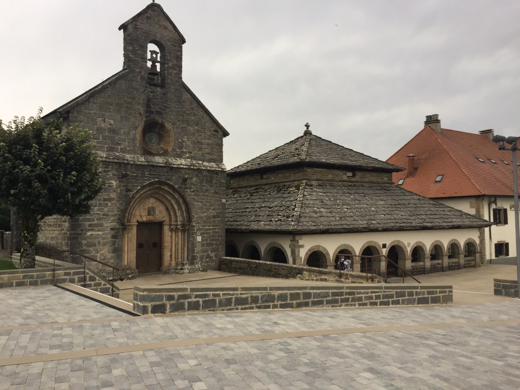 Achteinhalb Stunden nach dem Start am Morgen dann die Überquerung des Passes. Von da an nur noch steil bergab, durch einen Wald wie im Märchen. Inzwischen ist Silke wieder an meiner Seite. Auf spanische Zeitangaben auf den Schildern – 5,2 km / 1 h – darf man nicht reinfallen! Eine gefühlte Ewigkeit später erreichen wir die mittelalterliche Abtei Roncesvalles. Es ist kurz nach halb sechs und ich bin platt aber ziemlich stolz 🙂 Und da ich wenig Lust auf einen Schlafsaal mit 60 Leuten habe, gönnen wir uns zur Belohnung ein nettes Hotel mit luxuriösem Appartement (war das einzig freie Zimmer!), einem leckeren Abendessen und einer erholsamen Nacht.