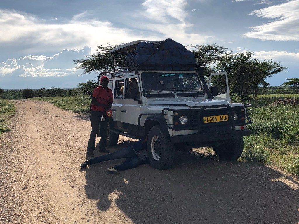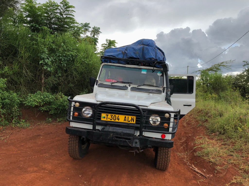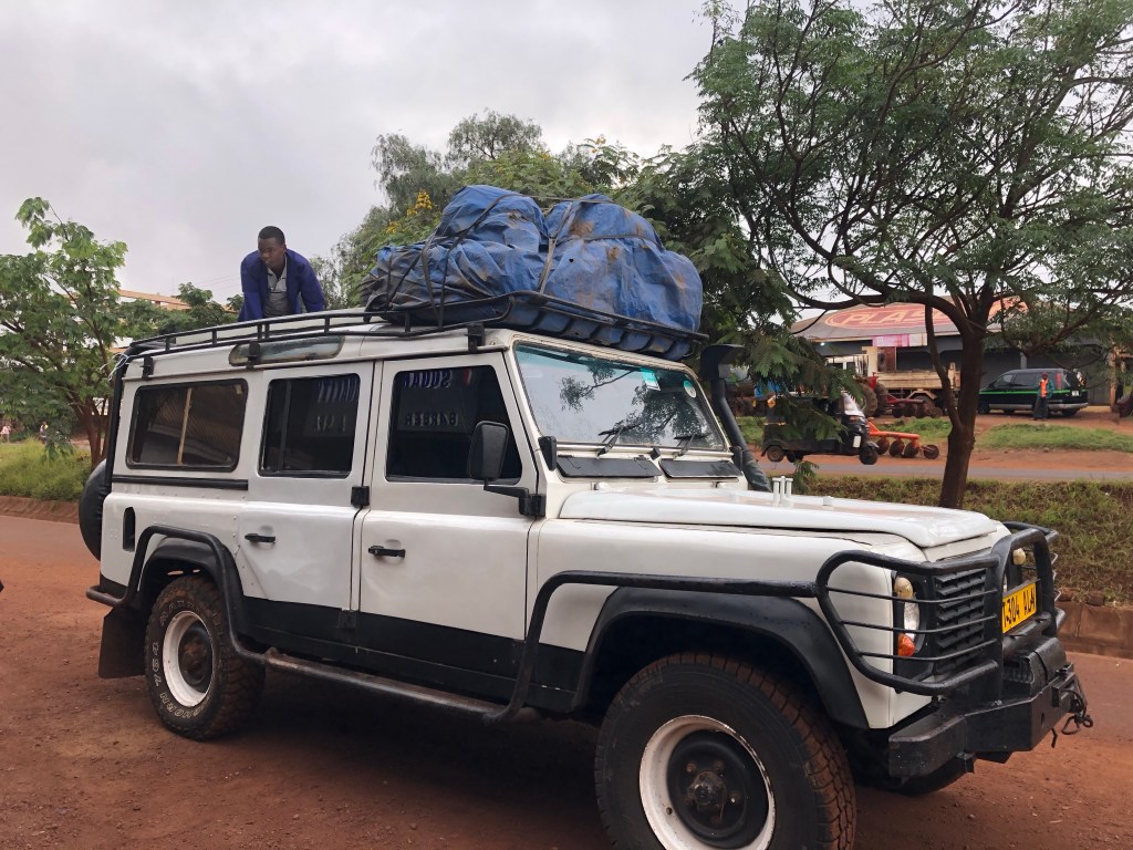 Da wir beim Abendessen von unseren drei Begleitern überredet worden waren, nicht vor dem Aufstehen zu starten, hatten wir die Abfahrtzeit auf 7 Uhr verschoben. Pünktlich steht dann heute der Jeep vor unserem Hostel, aus dem John, Johnson, Jonathan und ein jüngerer Junge aussteigen. Der Junge stellt sich als James vor, ist 14 Jahre alt und der Bruder von Jonathan. Uns interessiert, wie denn die anderen Familienmitglieder heißen und bekommen bereitwillig Auskunft: die Schwestern von John und Johnson heißen Juliana (Frau von Baraka) und Jennifer, dann gibt es noch Joffrey, Justin, Josef, Judith und Jeremiah! Wir stellen scherzhaft die Frage, ob die Familie wisse, dass es für Namen durchaus mehr Anfangsbuchstaben im Alphabet gäbe als J! Wir könnten gerne ein paar Vorschläge machen. Die vier lachen und so beginnt der Tag mit wesentlich besserer Stimmung als der gestrige geendet hatte. Diesmal muss nicht nur das Gepäck aufs Dach gehieft und dort verstaut werden, sondern es tauchen auch noch vier Autoreifen aus dem Inneren des Jeeps auf, die außen am Auto mit Schnüren befestigt werden. Dies alles geschieht gründlich und in einer Ruhe, so dass es inzwischen 7:45 Uhr ist, als wir uns alle in den Jeep quetschen (7 Plätze für 8 Personen plus Restgepäck).