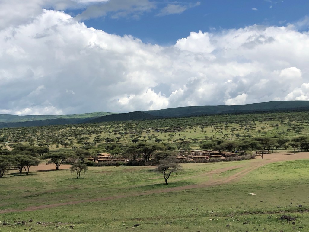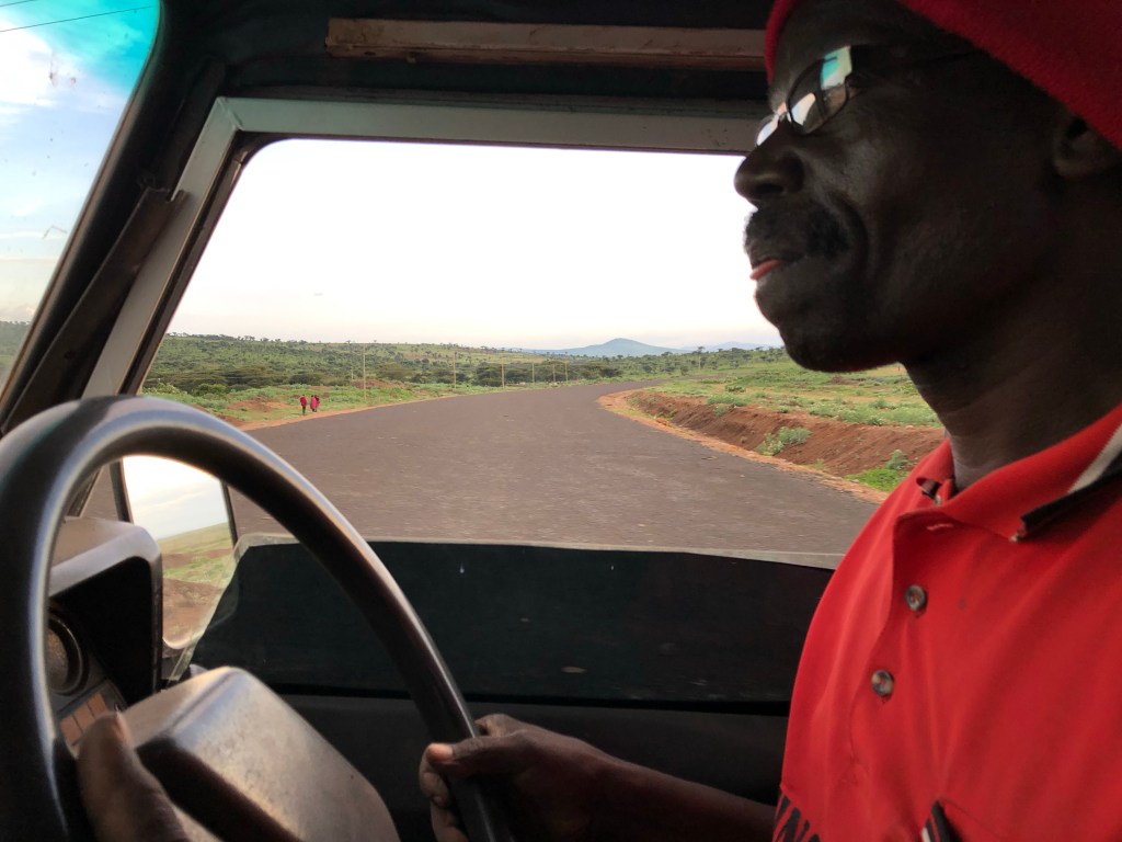 Es ist inzwischen 18:30 Uhr und John fährt immer noch voll konzentriert. Welch eine Leistung bei diesen „Straßen/Wegen“, die eigentlich keine sind und uns Mitfahrer oft heftig durchschütteln. Ich frage mich, wie wir am Vortag diesen Weg gefunden hätten, denn es wäre schon direkt nach dem Krater dunkel geworden. Und schon heute treffen wir über mehrere Stunden kein einziges Fahrzeug. Nur Massai, deren Heimat dieses riesige Gebiet ist, sehen wir immer wieder, sowohl Hirten, die ihre Kuh-, Ziegen- und vereinzelt auch Schafherden hüten sowie deren in den Busch geduckte Dörfer.