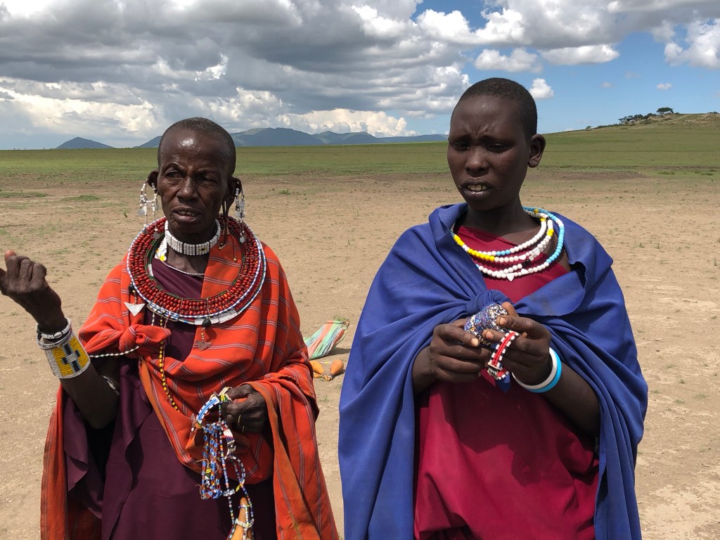 Wir sind noch nicht von der Düne herunter, da kommen zwei Massaifrauen auf unseren Jeep zugelaufen, die uns ihren selbstgemachten Schmuck anbieten (die Händler sind auch hier!). Sie fordern einen zu hohen Preis für den Stern aus kleinen, bunten Kunststoffperlen, den ich kaufen möchte, sagt Jonathan und handelt noch aus, dass ich ein Foto von den beiden machen darf. Für mich sind die umgerechnet vier Dollar nicht soo viel und ich gebe sie gerne. Aber den beiden Frauen ist es nicht genug und sie fordern nach dem Foto noch eine extra Bezahlung dafür. Okay – nochmal 1.000 Tansania Schilling mehr. Freundlicher schauen die beiden danach aber trotzdem nicht..
