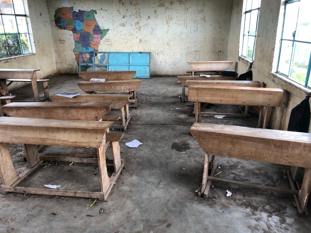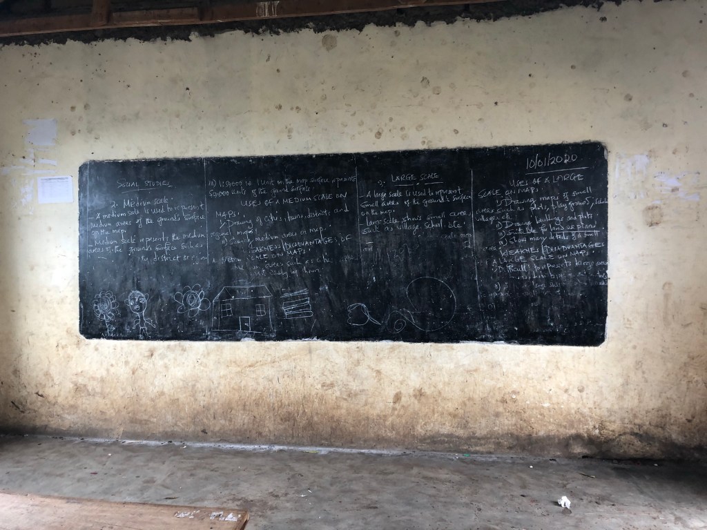 Die Wände des Klassenraums sind schmutzig und die Farbe blättert ab. Auf der hinteren haben Volunteers den afrikanischen Kontinent gezeichnet – es fehlt aber der Rest der Welt. Die Tür zum Klassenraum ist defekt und liegt im Klassenraum.