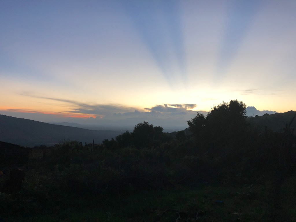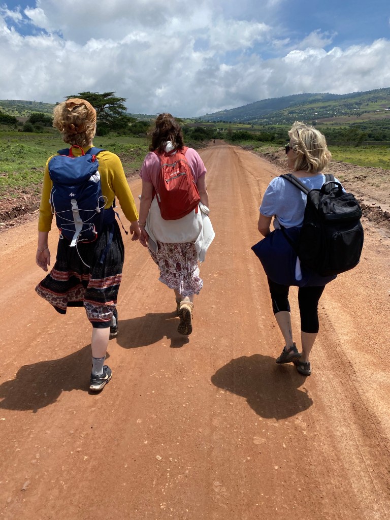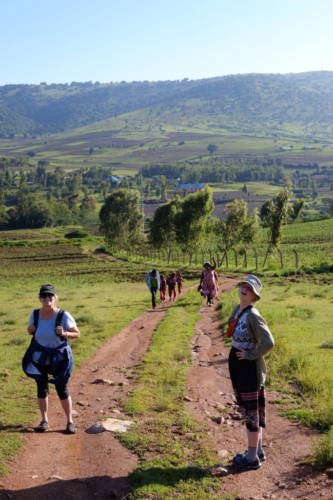 Der Berg liegt auf der anderen Seite der Hauptstraße und ist nicht furchtbar steil. Die drei Massaimädchen hüpfen in ihren dünnen Schuhen vor uns her über den erdigen Pfad, der zunächst zwischen Weideflächen entlang führt, auf denen auch Büsche und einige Bäume wachsen. Von einer Wiese, auf der ein Trecker das Gras mäht, weht ein wunderbar würziger Duft nach Minze zu uns herüber. Obwohl es keine Minze ist, wie Juliana uns versichert. Die Abendsonne taucht die grüne, fast liebliche Landschaft in ein sanftes Licht. Ich genieße diese Natur ebenso wie die Menschen um mich herum, die mir nach fast einer Woche schon sehr vertraut und lieb geworden sind.