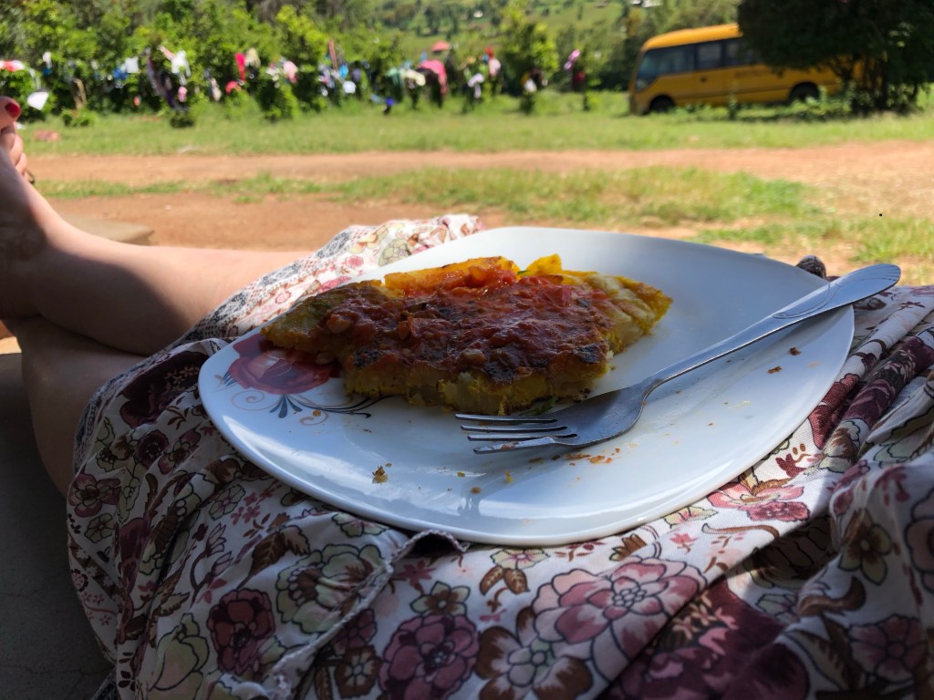 Gegen 13 Uhr wandern wir alle gemütlich nach Hause zum Lunch. Unvorstellbar, dass wir immer so Hunger haben, trotz der drei reichhaltigen Mahlzeiten pro Tag. Inzwischen ist es ziemlich warm geworden und ich schlage vor, unser Mittagessen auf den Stufen vor dem Haus einzunehmen. Es ist toll, so in der Sonne zu sitzen und auf die grünen Hügel gegenüber zu schauen.