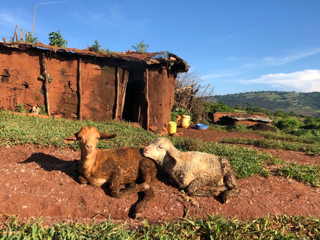 Denn inzwischen ist klar, dass es afrikanische 20 Minuten sind. Was aber auch daran liegt, dass Juliana und Margret sich ganz gewissenhaft an die afrikanische Parole „Pole, Pole!“, „Langsam, langsam!“ halten 😀 Eine Stunde stapfen wir schon den Berg hoch und sind noch lange nicht am Ziel. Inzwischen ist der Weg steiniger und ein Massaijunge mit seiner Herde aus Schafen, Ziegen und Kälbern hat sich zu uns gesellt. Die jungen Tiere sind entzückend, versuchen im Laufen bei ihrer Mutter zu trinken und lassen sich streicheln, zumindest, so lange sie auf das Nuckeln an der Zitze fokussiert sind.