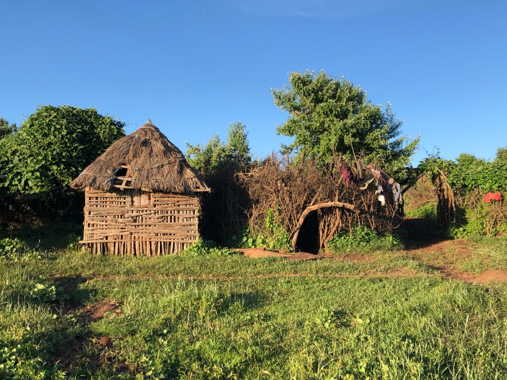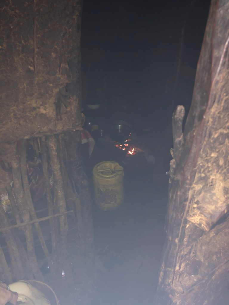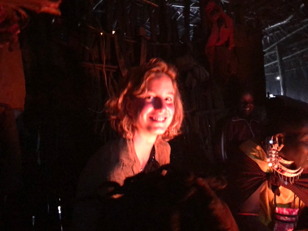 Für Juliana, Sophie und Dennis sind noch drei weitere Hocker da. Pat und ich haben Glück, der Rauch zieht auf die gegenüberliegende Seite und nach einer Weile der Gewöhnung ist das Atmen und Sehen einfacher für uns. Da sitzen wir also in gemütlicher, enger Runde in einem Massaihaus und ich fühle mich absolut großartig. Wir bewundern das Haus und Supatis Mutter erklärt uns, dass sie es in drei Monaten selbst gebaut hat. Das Grundgerüst besteht aus stabilen Ästen, die in den Boden gerammt sind. Die Wände bestehen aus Ästen und Zweigen, die mit einer Mischung aus Lehm und Kuhdunk quasi verputzt werden. Ähnlich wird das flache Dach gefertigt. Häuser werden immer von den Frauen gebaut. Und sie wirken auch stolz darauf.