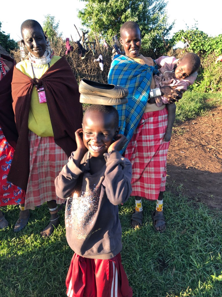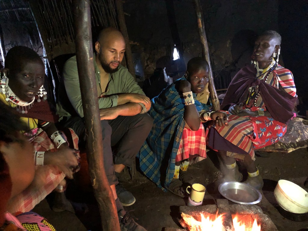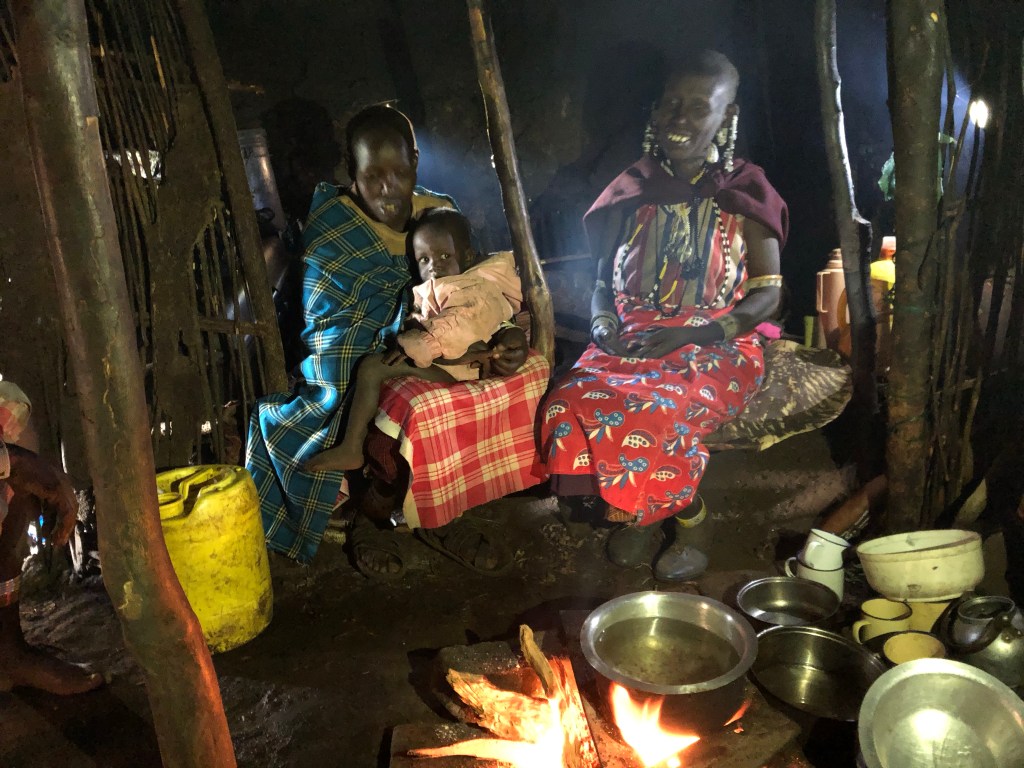Die Luft wird etwas kühler, das Licht noch abendlicher, als wir nach einem letzten Bergkamm das Dorf erreichen. Wir werden erwartet, denn Supati ist uns schon vorausgegangen. Ihre Mutter und eine weitere Massai stehen vor einem niedrigen Lehmhaus und begrüßen uns herzlich. Hände werden geschüttelt, Juliana macht uns bekannt und wir bekommen die Erlaubnis, Fotos zu machen. Supatis Mutter lädt uns auf einen Tee in ihr Haus ein. Dieser Einladung und den drei Massaifrauen folgen wir gerne, auch wenn Juliana uns vor dem starken Rauch in der Hütte warnt.