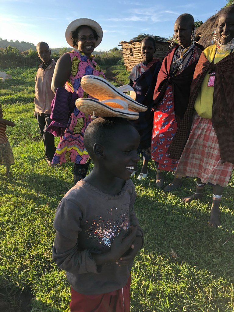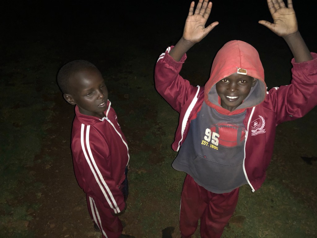 Ein herzlicher Abschied von unseren Gastgeberinnen und im allerletzten Tageslicht laufen wir zusammen mit den drei Mädels, Juliana und Margret den Berg hinunter. Ich habe Naningoi an der Hand und wir beide laufen voraus. Naningoi kennt den Weg auch im Dustern und springt wie ein Reh – ich muss aufpassen, dass ich mithalten kann.