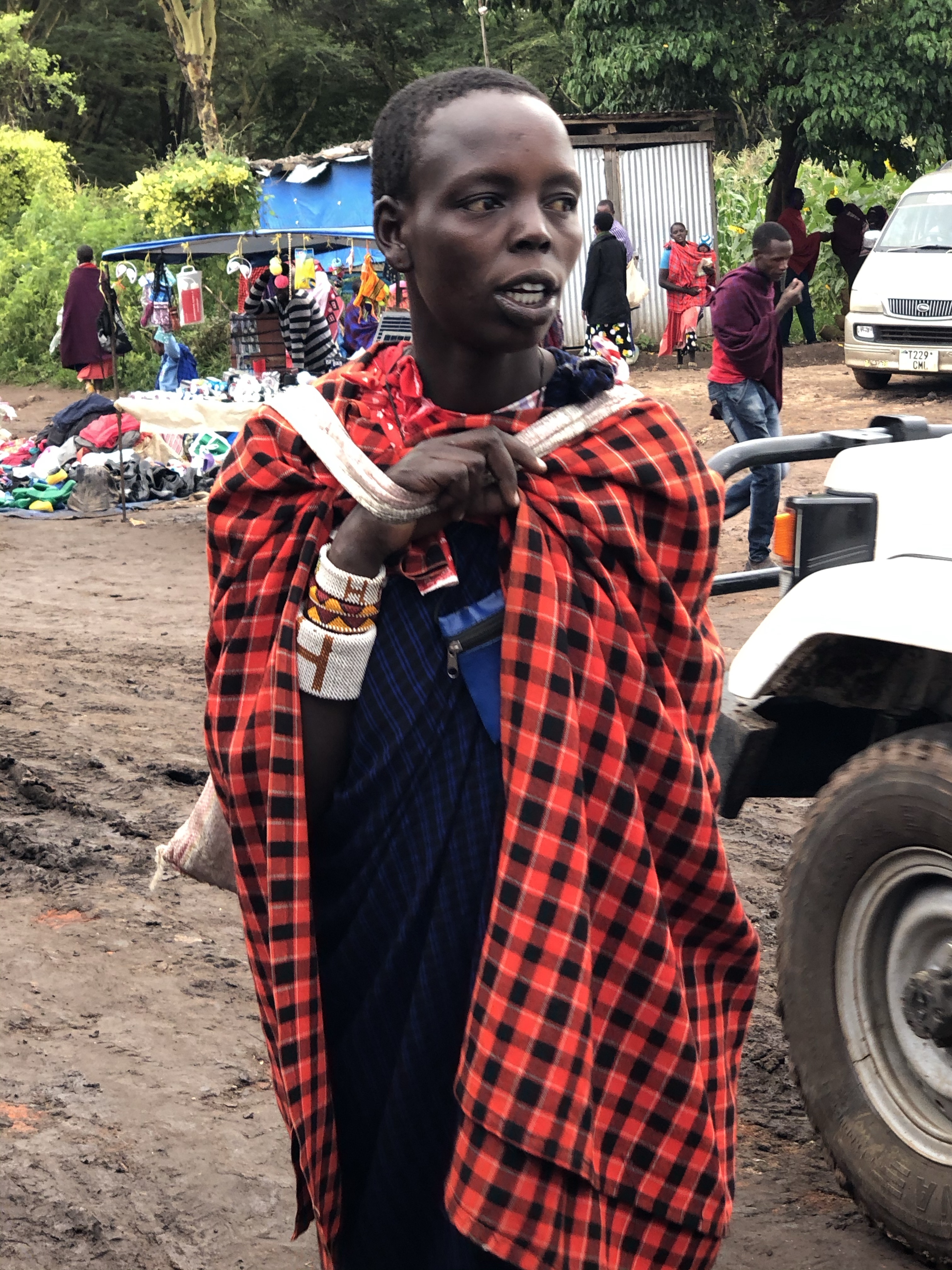 Am Ausgang des Marktes bewundere ich noch die traditionellen Massai Messer und Speere, die ein Mann anbietet, bevor Baraka mit seinem Auto eintrifft und uns wieder einsammelt.