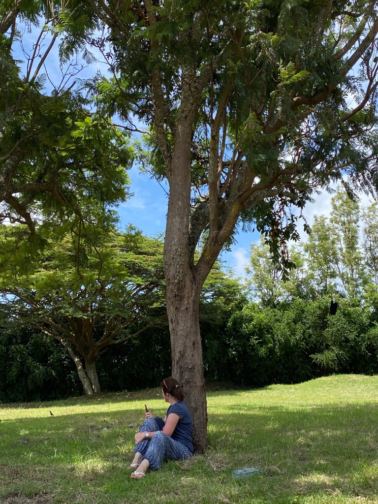 Es dauert und dauert aber, bis Juliana und Baraka endlich fertig werden. Sie sind beide immer sehr busy, viel am Telefon, und für uns ist dann warten angesagt. Ich gehe schon mal vor die Tür und will nach dem Puppy sehen. Sie liegt nicht mehr unter dem Baum, sondern wieder auf ihrem Stammplatz unter der „Scheune“ aus blauem Blech, in der das Dormitory der Jungs ist.