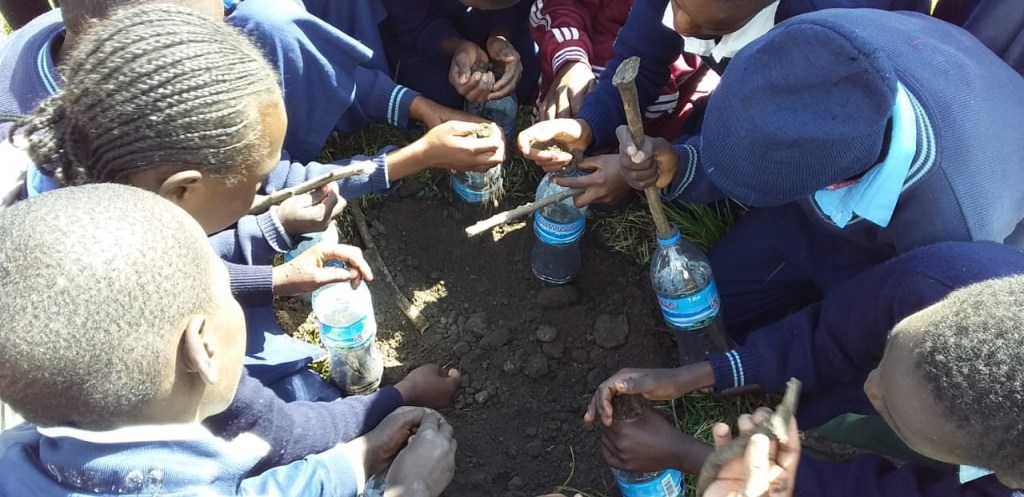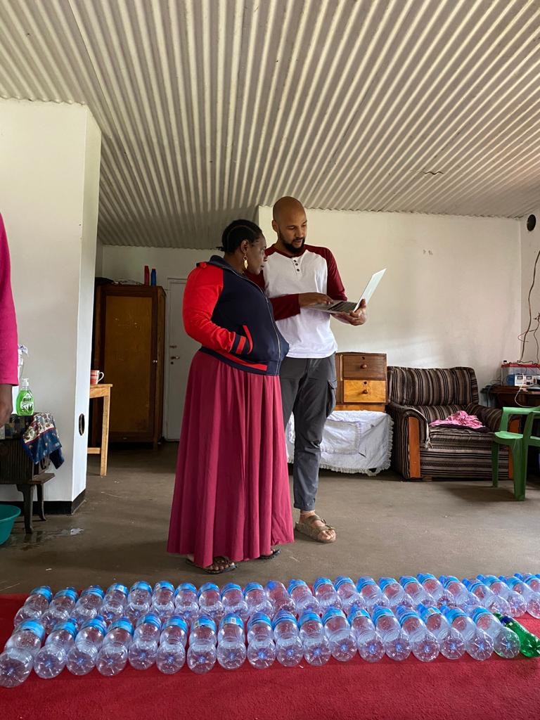 Die Wände des Tanks sollen aus mit Erde gefüllten Wasserflaschen und Zement bestehen. Flaschen wurden schon fleißig gesammelt und von vielen helfenden Händen mit Erde gefüllt.