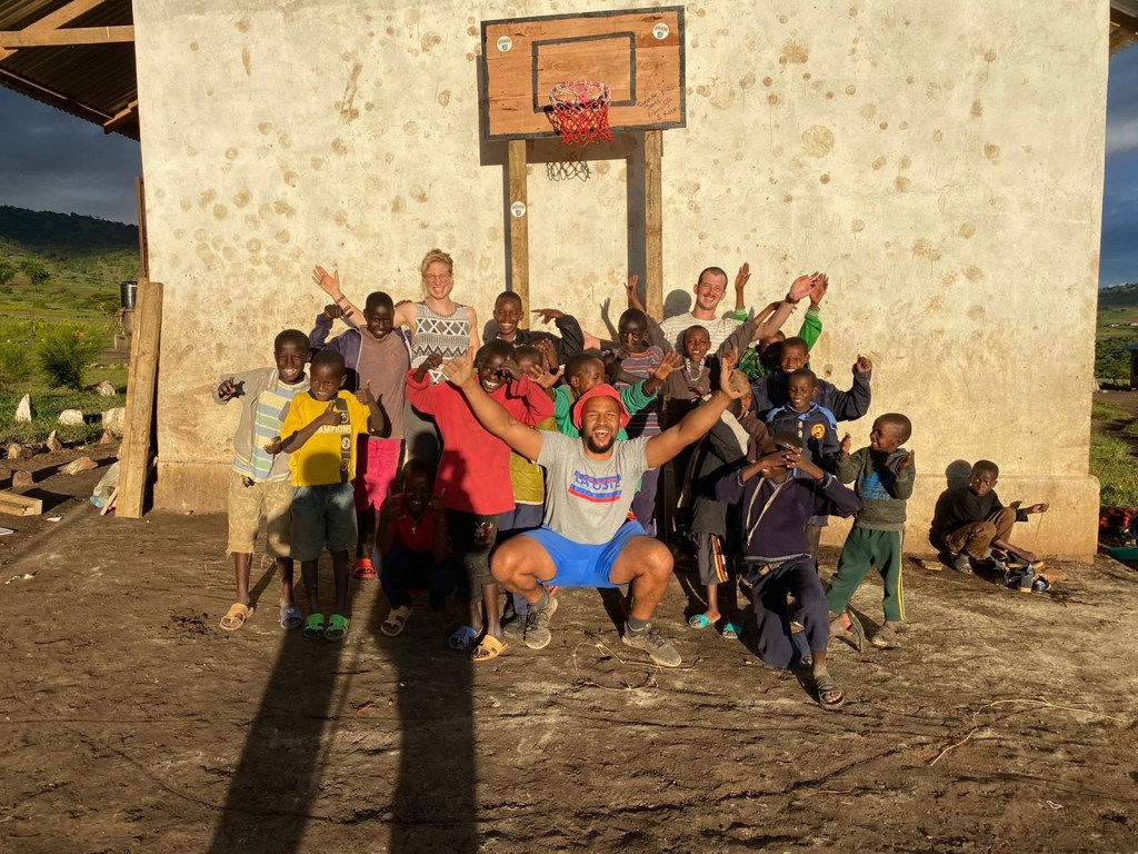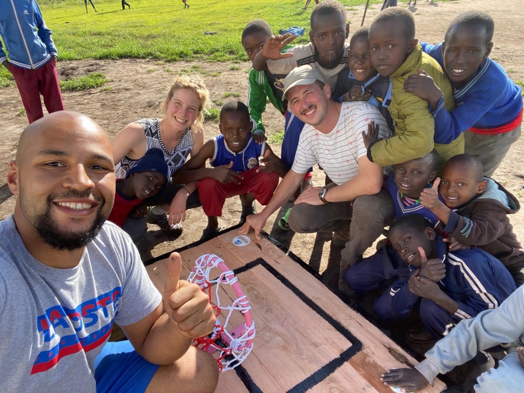 Das zweite Projekt ist nicht ganz neu, denn Kim hatte Dennis aus Arusha einen Basketball inklusive Metallkorb mitgebracht. Jetzt haben Dennis, Sophie und Rúben damit begonnen, den Korb an einer Holzplatte zu befestigen und diese auf zwei langen Holzpflählen an die Außenwand des Boys Dormitory zu stellen.