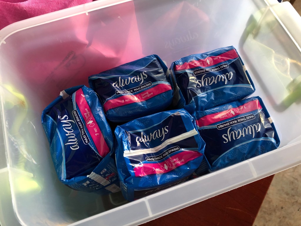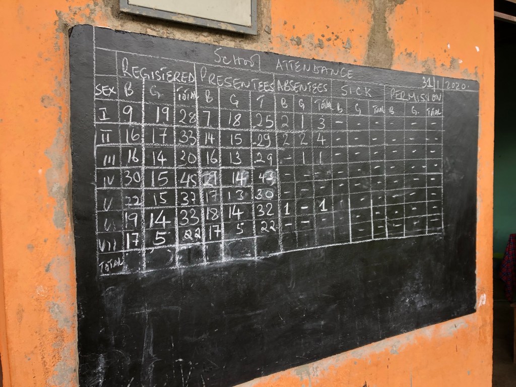 Am neuen Board vor dem Sekretariat steht jetzt jeden Tag die Anzahl der anwesenden und der fehlenden Schüler und im Sekretariat werden die von mir besorgten Binden in einem Behälter aufbewahrt, den Sophie gekauft hat.