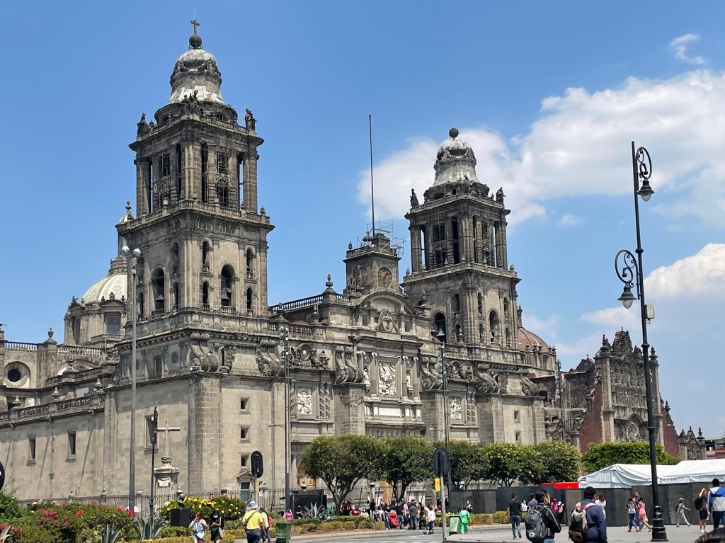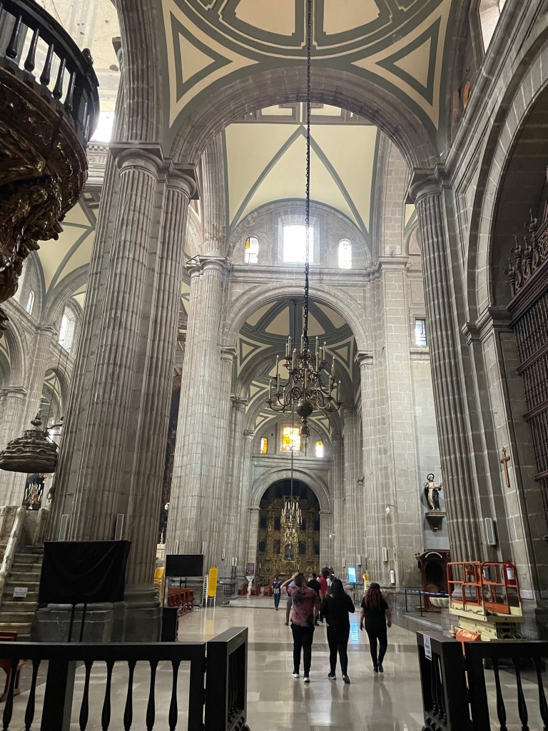 Den Palacio National wollen wir uns für einen späteren Besuch aufheben, jetzt geht es erstmal in die Kathedrale. Sie ist die größte und älteste Kathedrale des amerikanischen Kontinents, deren Grundstein 1524 gelegt wurde, also schon kurz nach der Eroberung des Aztekenreiches durch die Spanier unter Hernán Cortés in den Jahren 1519-1521. Die riesige Kirche erinnert mich stilistisch sehr an einige Kirchen auf meinem Jakobsweg in Spanien, die tatsächlich als Vorbild für diesen Bau dienten. Er besteht aus fünf Schiffen mit 14 Kapellen und seine prunkvolle Ausstattung veranschaulicht deutlich den immensen Reichtum an Gold und Silber dieses Landes. Allerdings, die ganze Kirche ist schief! Sie neigt sich – und nicht zu knapp – nach rechts (wenn man Richtung Altar schaut). Etliche Baumaßnahmen haben in den letzten Jahren die Kirche stabilisiert und dafür gesorgt, dass sie nicht einstürzt. Ursache für die missliche Lage ist der Untergrund, der alles andere als fest ist. Das gilt aber nicht nur für die Kirche, die gesamte Stadt ist auf einem trockengelegten See gebaut!