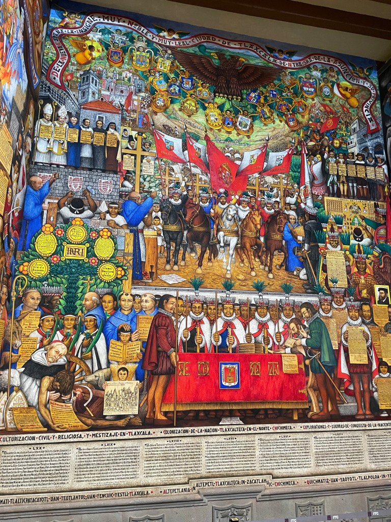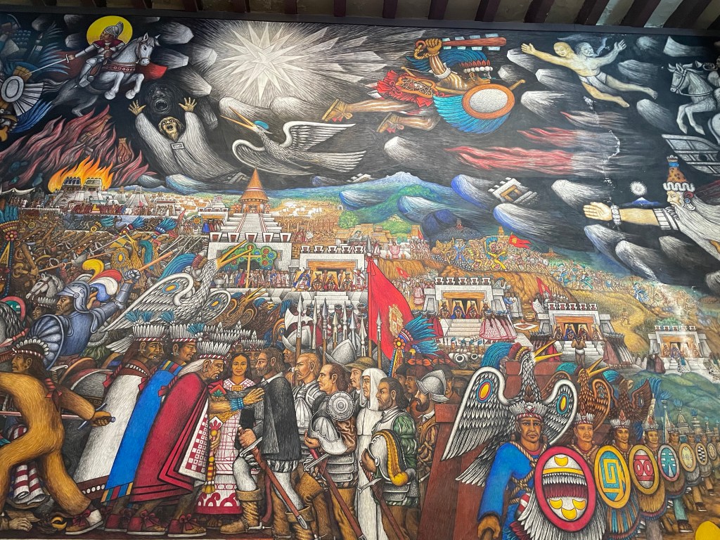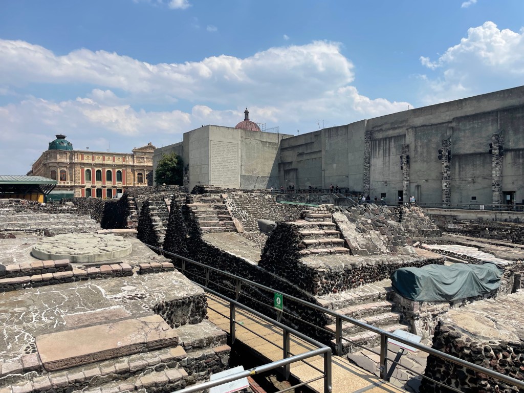 Als die Spanier 1521 nach einem letzten, erbitterten Kampf Tenochtitlan einnahmen, zerstörten sie systematisch jede sichtbare Erinnerung an die alte Kultur und erbauten dort, wo die großen Tempel standen, ihre Kirchen. Auf den Fundamenten des Herrscherpalastes wurde ein Palast für Cortés errichtet, zum Neubau wurden die Steine der Aztekenstadt verwendet. Heute zeugt in der Hauptstadt nur noch ein verhältnismäßig kleiner, 1978 archäologisch freigelegter Bereich neben der Kathedrale von der einstigen Architektur der aztekischen Bauten. Er gehörte zum größten und wichtigsten Tempel Tenochtitlans, der großen Pyramide Huey Teocalli. Elena, Bibi und ich werfen von außen einen Blick auf Reste des einstigen Heiligtums. Es ist schon erschütternd, so vor Augen geführt zu bekommen, wie Menschen miteinander umgehen. Dieses hier ist ein historisches Beispiel. Aktuell erleben wir ja gerade auch in der Ukraine voller Grauen, wozu Menschen in der Lage sind. Wird es sich jemals ändern? Werden wir jemals in der Lage sein, wirklich friedlich miteinander zu leben?