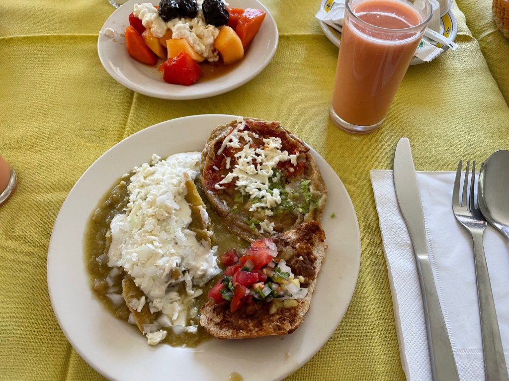 Die Hacienda beherbergt ein Hotel und ein Restaurant und da wir alle etwas hungrig sind, lassen wir uns an einem Tisch in dem üppig begrünten Patio nieder. Nach längerer Diskussion einigen wir uns darauf, dass diesmal ich bezahle. Yes! Ich esse ein aztekisches Hühnchen – natürlich sehr lecker – und als Nachtisch gibt es …. Keine Ahnung, wie wir darauf gekommen sind, aber das Gespräch dreht sich über Erinnerungen. Filo ist felsenfest davon überzeugt, dass ihr Vater ihr, als sie noch klein war, eines Abends Aurora Borealis, also Nordlichter, gezeigt hat. Dabei ist es komplett unmöglich, in Mexiko Nordlichter zu sehen. Das weiß auch Filo. Aber sie hat eine so lebhafte Erinnerung an diesen Abend, dass sie sie für real hält. Elena, Sophia und Bibi kennen natürlich diese Geschichte. Sie sorgt regelmäßig für ausufernde Streitgespräche in der Familie. Und auch das gehört zur Tradition: wenn Filo mit den Nordlichtern kommt, dann erzählt Elena, dass sie in ihrem früheren Leben die Reina Isabella von Spanien war. Sollte es so etwas wie Reinkarnation geben, hielte ich das sogar durchaus für möglich 😉 Elenas ganzes Auftreten zeigt tatsächlich königliche Allüren 🙂 Sophia, um nicht zurückzustehen, setzt noch einen drauf. Sie sei der Überzeugung, einer der sieben Zwerge gewesen zu sein. Mir ist sofort klar, welcher, sage ich! Bei dem vielen lauten Geniese am Morgen (ich habe bestimmt fünf Mal salud, Gesundheit gesagt), kann sie nur Hatschi sein 🙈 Diese ganze Unterhaltung wird vorwiegend in Spanisch und nur wenig in Englisch geführt und ich bin sehr froh, dass ich inzwischen schon einen großen Teil verstehen kann 🙂