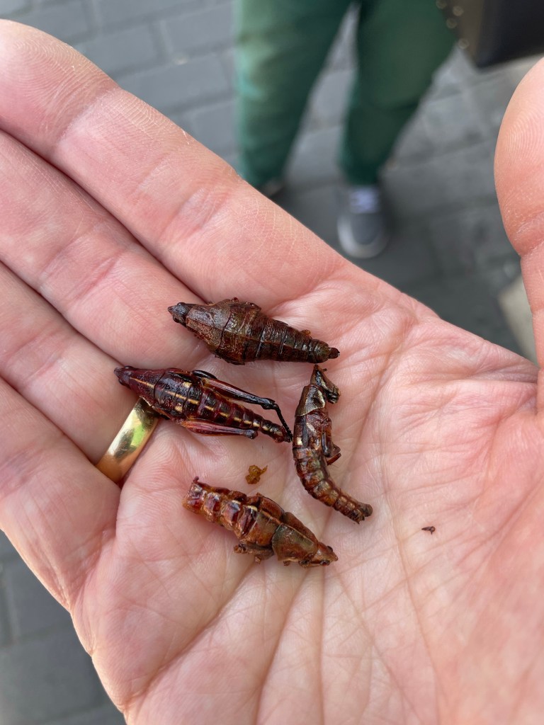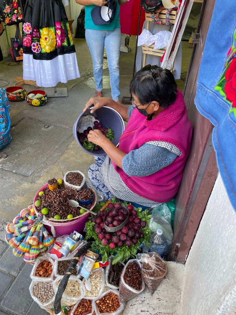 Der Weg vom Parkplatz zur Kirche führt vorbei an etlichen kleinen und größeren Geschäften, die alles bieten, was das Touristenherz begehrt. Zahlenmäßig noch mehr vertreten sind aber die vielen Straßenhändler, die ebenfalls alles mögliche und unmögliche anbieten. Unter anderem in großen, randvoll gefüllten Eimern Chapulines. Und Chapulines sind … Heuschrecken! Zum Glück nicht lebendig (ich erinnere mich noch an die Heuschreckenplage vor zwei Jahren in Tansania), sondern schön geröstet und kross 🙂 Ich werfe nur einen Blick darauf, schon fragt mich Filo, ob ich probieren möchte. Nun gut, klar! Mit einem Spritzer Zitrone schmeckt es dann auch … ganz ok. Ein großer Chapulinenfan werde ich nicht, aber es sind sehr gute Proteine!