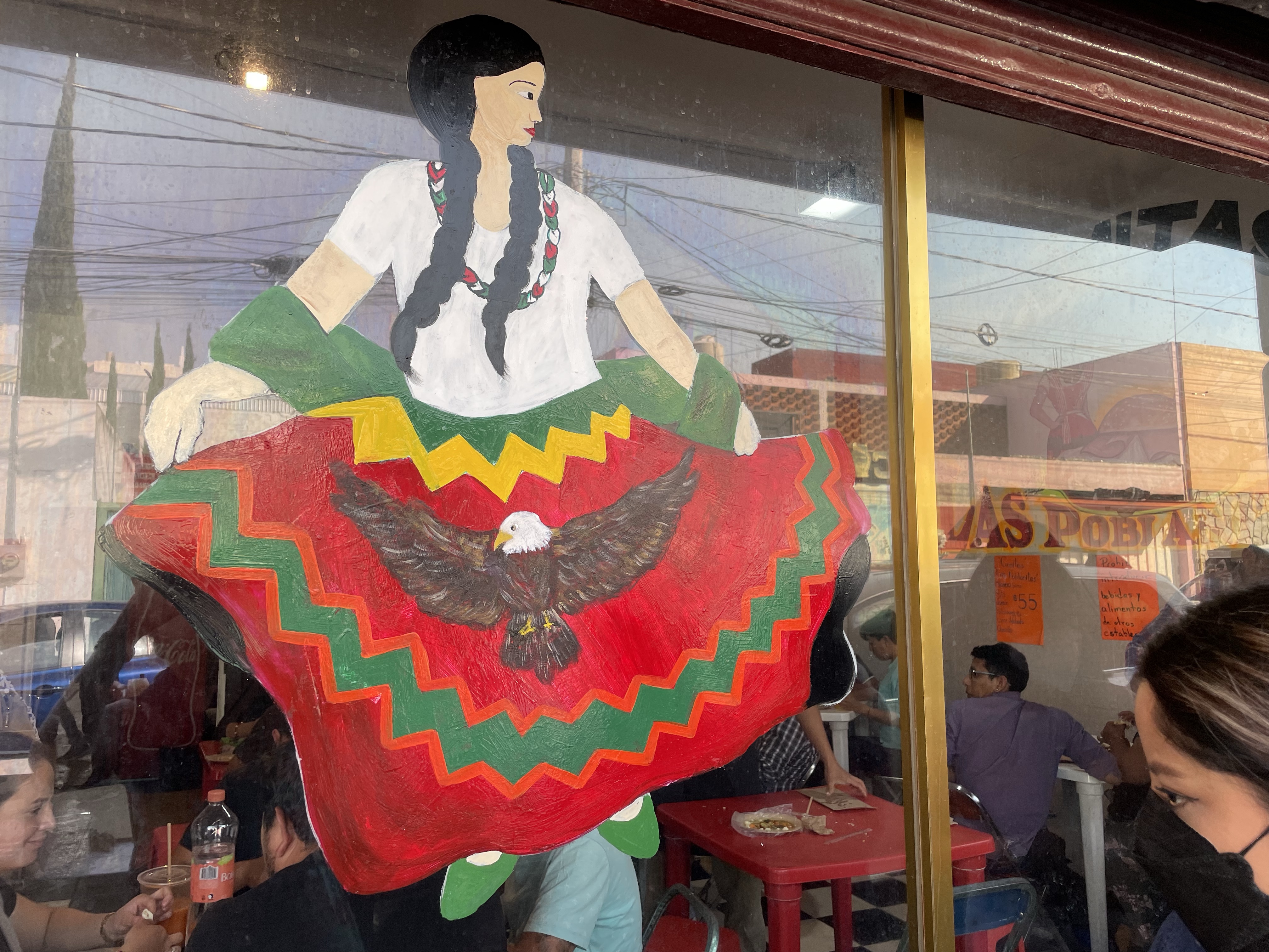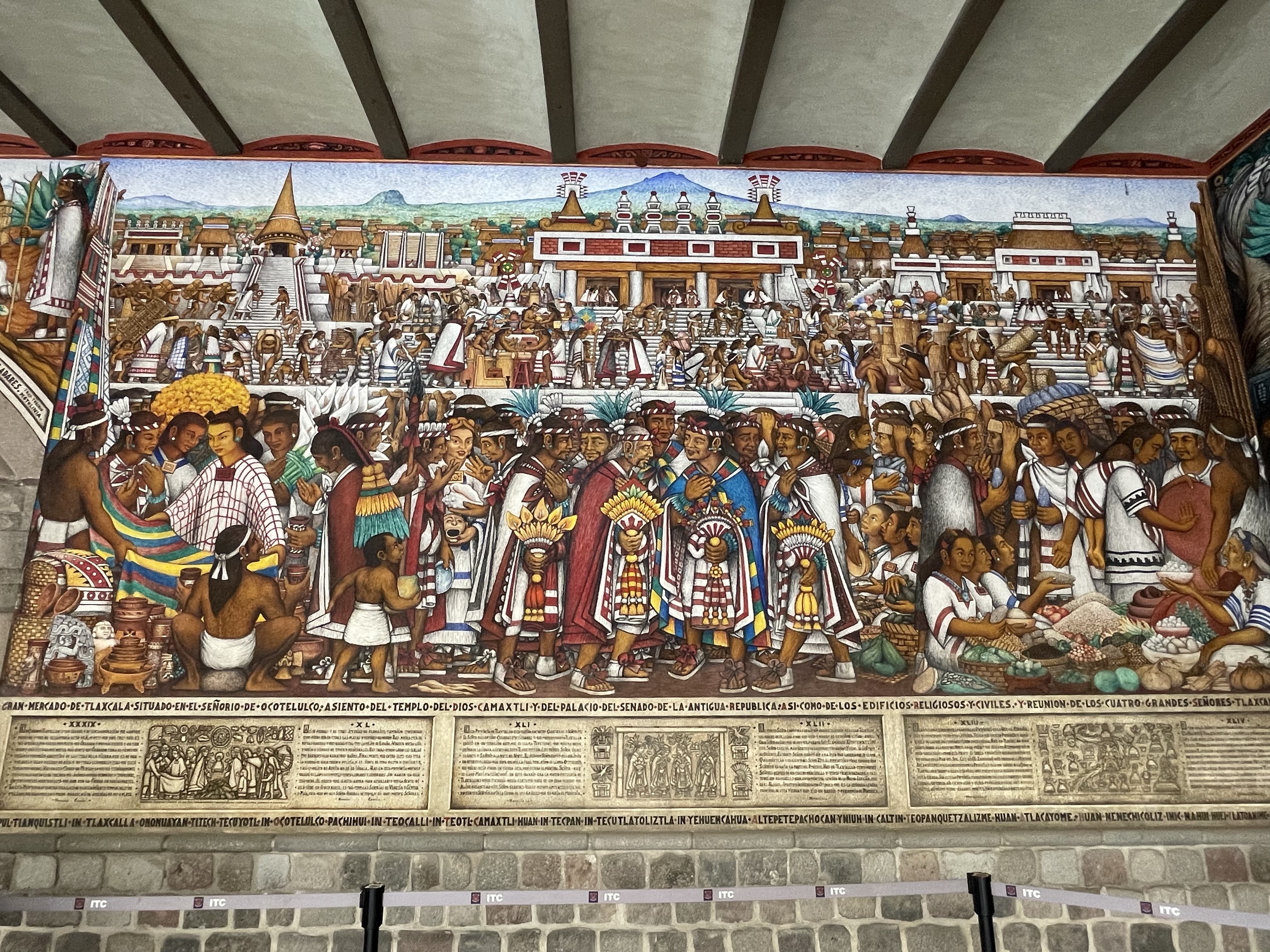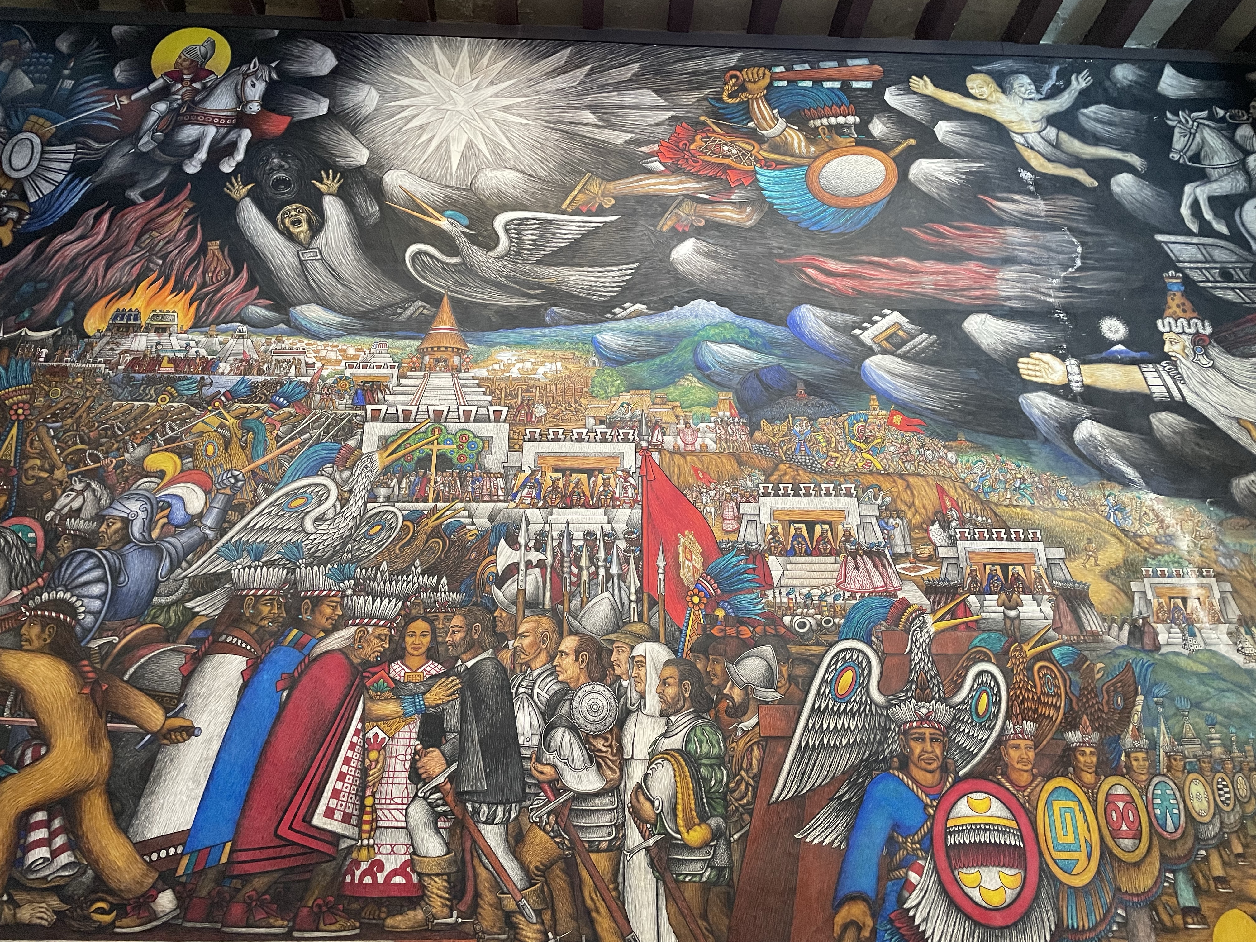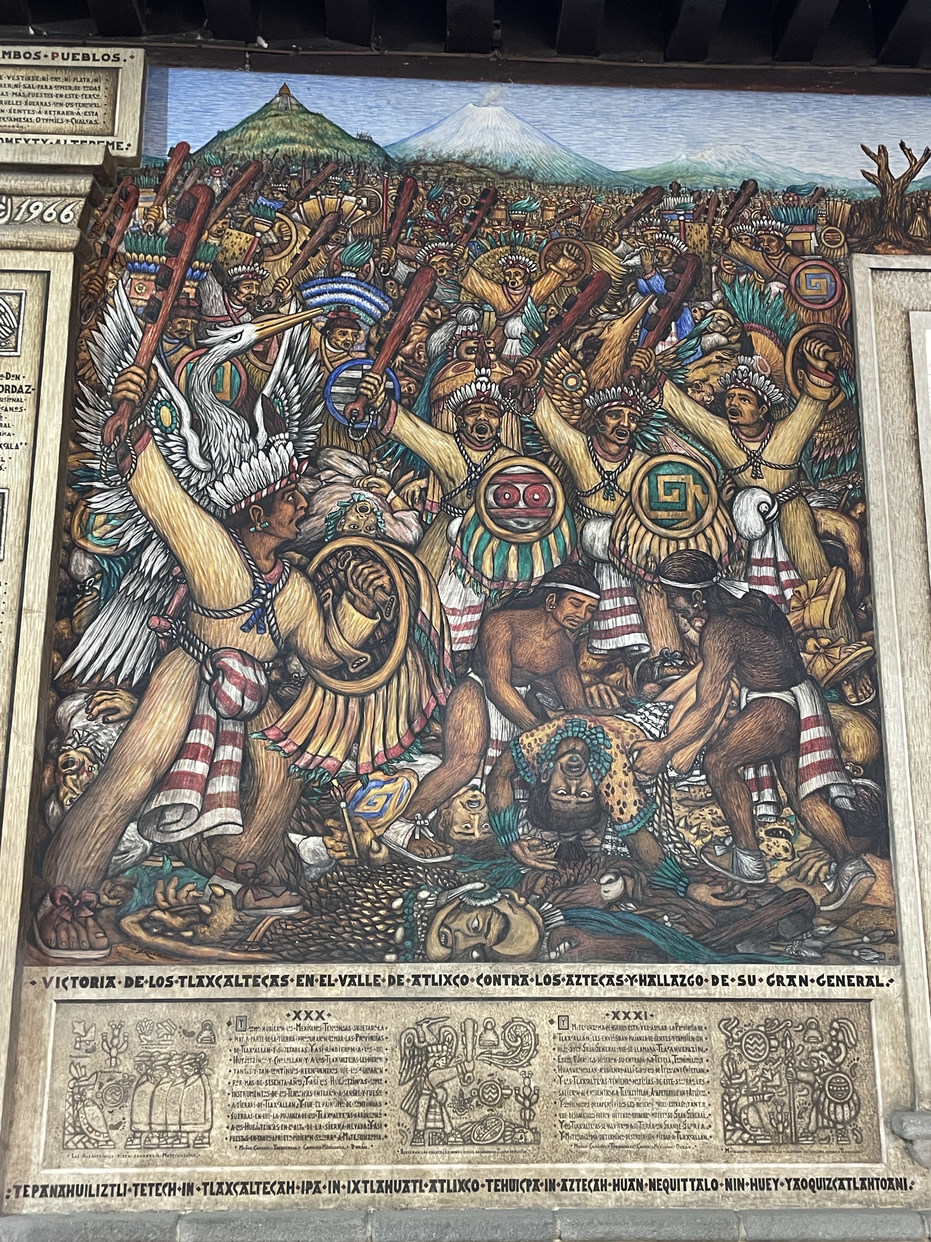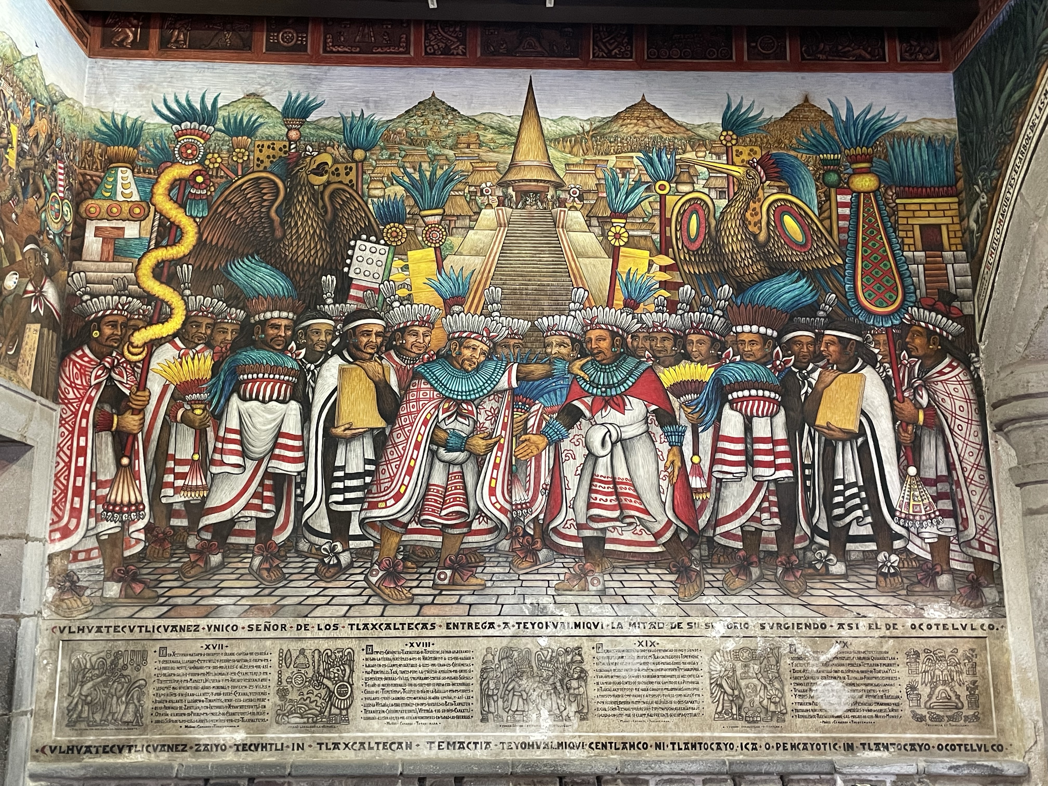 Am nächsten Tag, dem Sonntag, steht erstmal Tlaxcala auf dem Programm. Wir frühstücken alle, also mit Sophia, in einem Restaurant, wo ein mexikanisches Buffet mich dazu verleitet, mehr zu essen, als ich es normalerweise morgens tue. Aber es schmeckt auch zu gut! Gestärkt gehts dann zum Zócalo Tlaxcalas, wo wir im Regierungspalast eine Führung erhalten. Zu besichtigen gibt es dort nämlich grandiose Wandgemälde auf insgesamt 450 Quadratmetern, die die Geschichte Mexikos darstellen. Ich bin voll begeistert davon, denn die Bilder veranschaulichen einprägsam das Leben der Azteken, ihre Traditionen und Gebräuche, die Ankunft der Spanier, die vielen Kämpfe und schweren Verluste auf beiden Seiten und der letztendliche Sieg der Spanier.