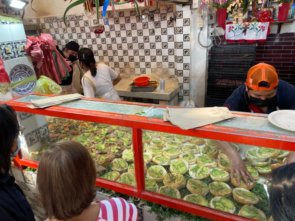 Nun haben wir Hunger und ich soll unbedingt eine weitere Spezialität kennenlernen: Cemitas. Noch weiß ich nicht, was das ist, aber wir kurven schon seit einiger Zeit durch mir etwas suspekte Straßen, was die Sache natürlich spannender macht. Schließlich haben die Damen doch das richtige Lokal entdeckt und wir nehmen tatsächlich in einer Art Schnellrestaurant an einem kleinen Plastiktisch auf Plastikstühlen Platz. Ich bin mehr als verwirrt und erstaunt. Es ist zum einen knüppeldicke voll hier und zum zweiten echt schmutzig. Der Boden besteht fast nur aus Essensresten und auch wenn ich diesmal echt dankbar für den Hygienefimmel meiner mexikanischen Familie bin – selbst nach der Reinigungsaktion des Tisches mit literweise Desinfektionsmittel fühlt sich dieser nicht wirklich sauber an. Oha!