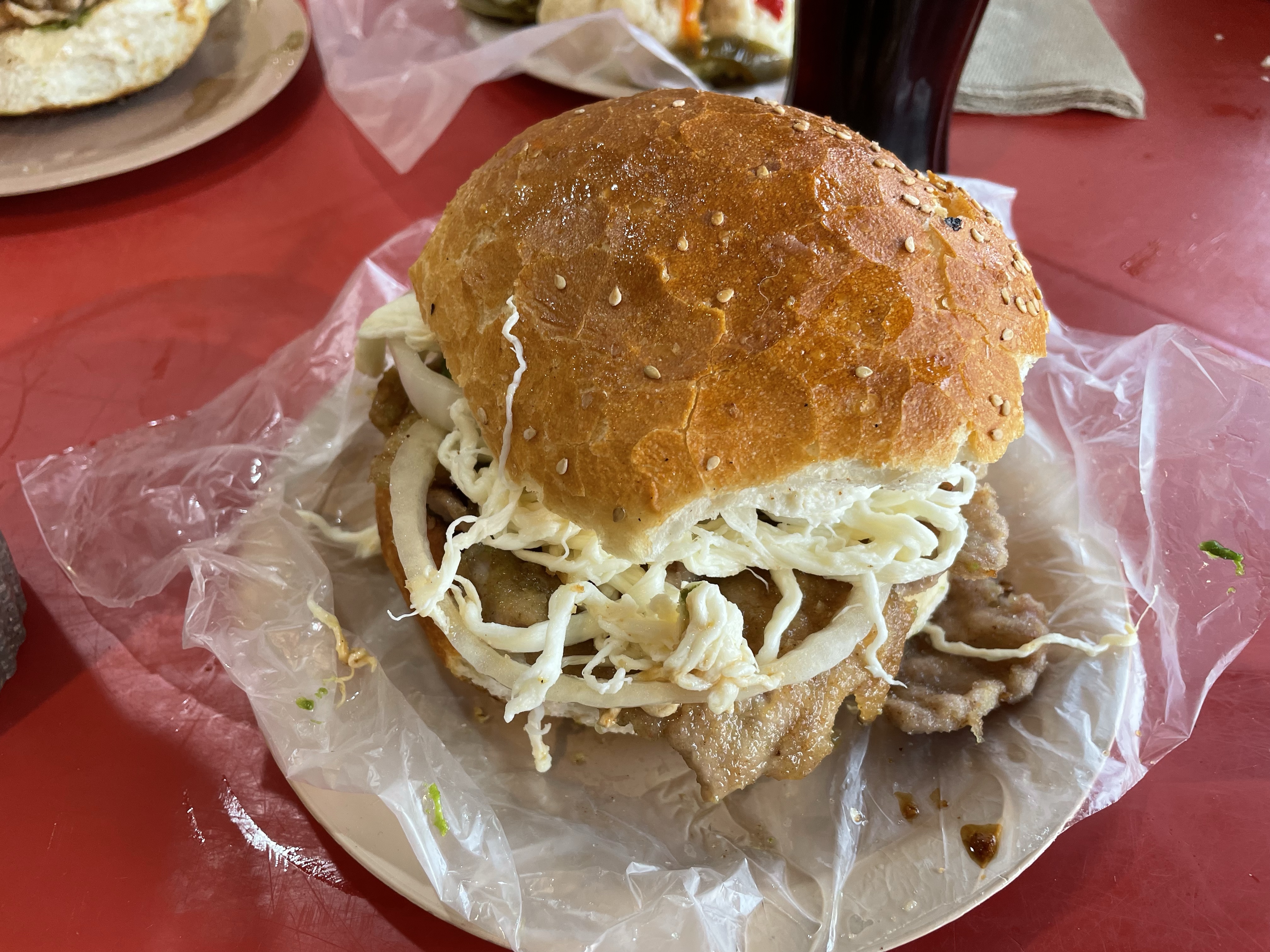 Bei einem Blick auf die Nachbartische ist mir auch klar, warum es hier so aussieht. Cemitas sind eine Art überproportionierte Hamburger (Bibi würde an dieser Stelle protestieren, aber ich finde den Vergleich durchaus gerechtfertigt), zwischen deren weichen Brothälften statt eines Hackfleischpattys ein ca DIN A5 großes, mega fettiges Schnitzel in Salsa, Salat, Gemüse und einer Übermenge an Käse eingebettet ist. Das Gericht kann man gar nicht essen, ohne das etwas heraus- und herunterfällt. Das schaffe ich niemals aufzuessen! Dachte ich… aber dann ging’s doch. Es war echt lecker und groß gekleckert habe ich auch nicht 😉