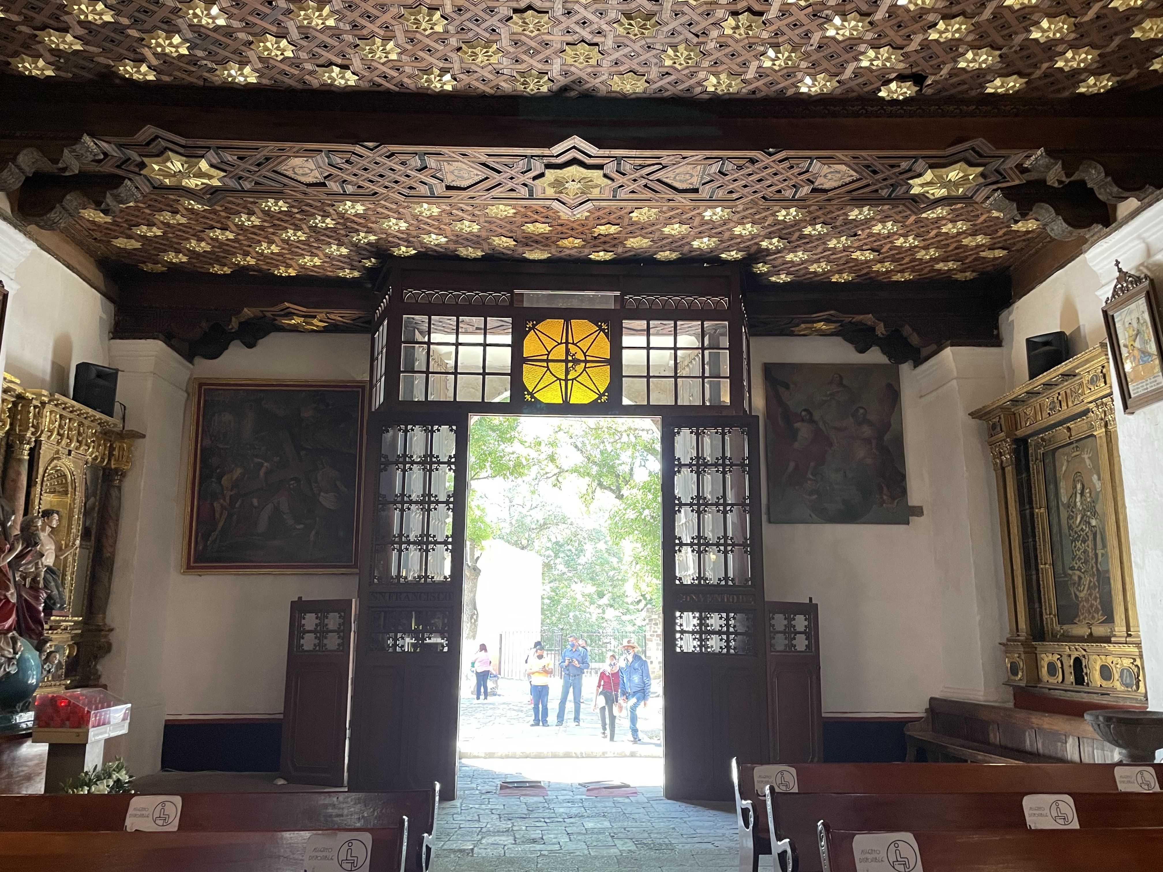Weiter geht es zur Kathedrale der Stadt, die auf einem Hügel liegt und die mich nun wirklich begeistert. Sie ist ein Franziskanerkloster aus dem frühen 16. Jahrhundert und gehört seit 2021 zum Weltkulturerbe. Die Kirche ist eher schlicht und erhaben, hat eine wunderschöne Holzdecke, gut, auch ein paar goldene Altäre, aber nicht furchtbar überladen, und ist definitiv meine Lieblingskirche in Mexiko.
