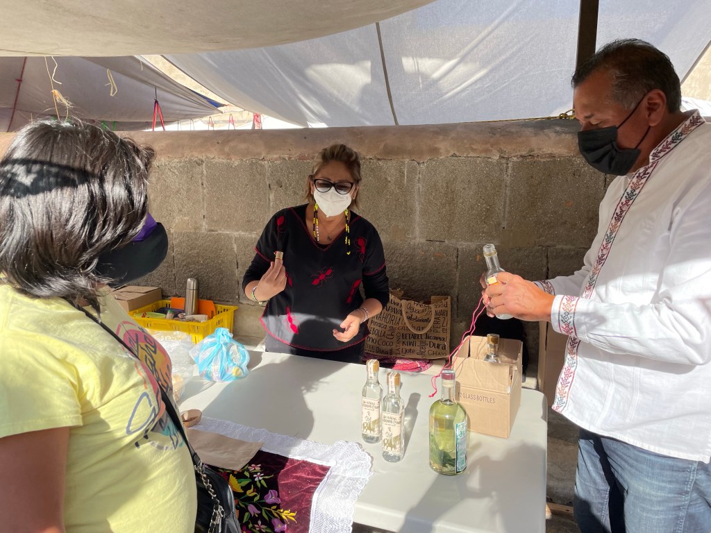 Und nun geht es aus der Stadt hinaus nach Huamantla. Wir fahren bestimmt eine gute halbe Stunde und erreichen schließlich die Hacienda Soltepec, die als letzter Punkt auf unserem Sightseeingprogramm steht. Im Hof findet ein kleiner Markt statt, aber wir sind etwas zu spät, denn die meisten Händler räumen ihre Sachen schon ein. Pulque gibt es allerdings noch genug und so komm ich in den Genuss, dieses mexikanische Nationalgetränk zu kosten. Es wird aus dem fermentierten Saft von Agaven hergestellt und hat einen Alkoholgehalt zwischen 2% und 6%. Pulque sieht aus wie Milch, also eigentlich ganz appetitlich, aber auch wenn es schon die Azteken tranken und es alle mögen, mir schmeckt es nicht so wirklich. Ok, dann vielleicht etwas Härteres? An einem Stand wird Mezcal angeboten, ein Schnaps, der wie Tequila aus Algaven hergestellt wird, mir aber zu stark ist. Schließlich fällt mein Blick auf einen Stand mit Eis – aus Pulque. Mir werden sofort Kostproben angeboten und weil ich mir ja vorgenommen habe, immer auch etwas zu kaufen, erstehe ich einen Becher mit grünem Pulqueeis. Und es schmeckt mir auch 🙂
